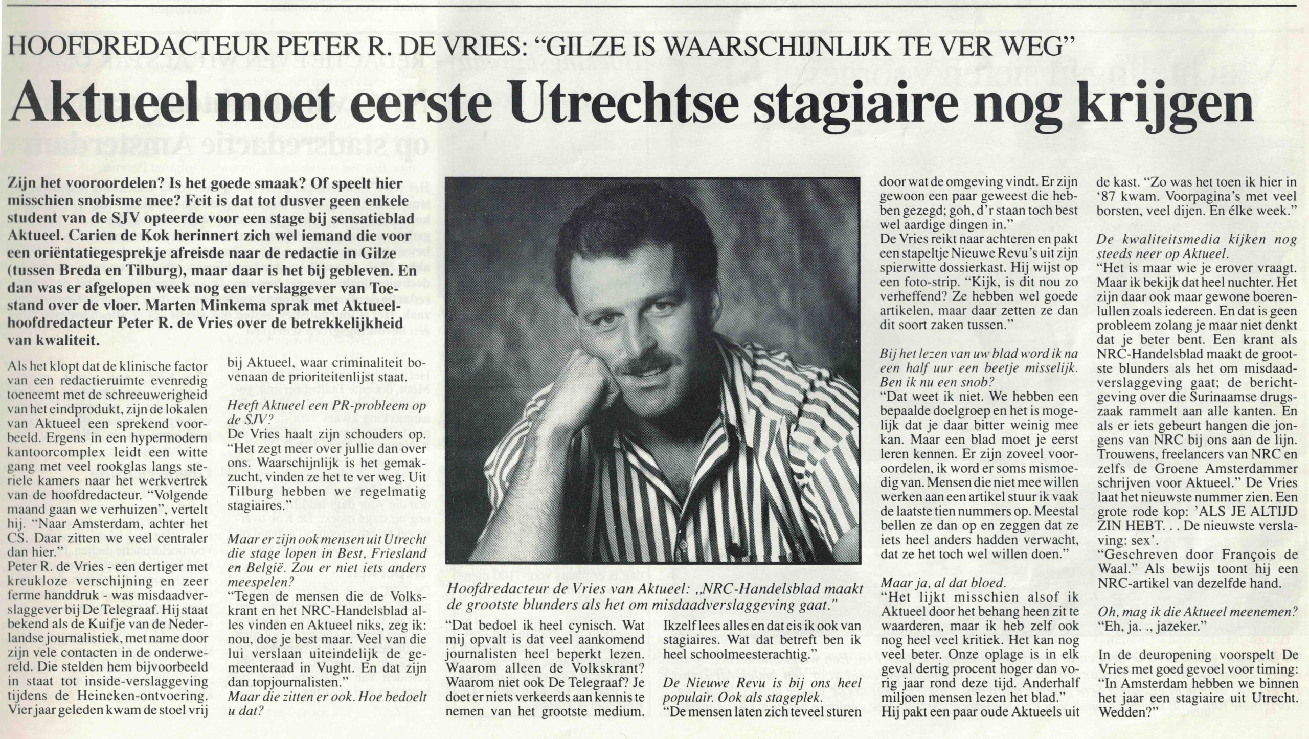 In 1991 zat ik op de School voor Journalistiek, waar ze niets van Aktueel moesten hebben. Ieder jaar waaierden honderden stagiaires uit naar alle geschreven pers; van de Winschoter Courant tot De Telegraaf en van het Bellebroekse Sufferdje tot de Groene Amsterdammer, Panorama en de Nieuwe Revu. Er was maar één stageplek waar helemaal niemand naartoe wou: Aktueel. He-le-maal niemand. Want: véél te ordinair. Die weigering bleef niet onopgemerkt bij ons op de redactie van schoolkrantje Toestand.