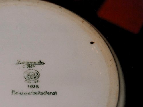 Het is een plomp geval, oerdegelijk. Mochten er onverhoopt bommen vallen tijdens de schaft, dan zette je hem gewoon op je hoofd. Op de onderkant staat dat de kom is gebakken voor de Reichsarbeitsdienst bij Hutschenreuther in 1938.