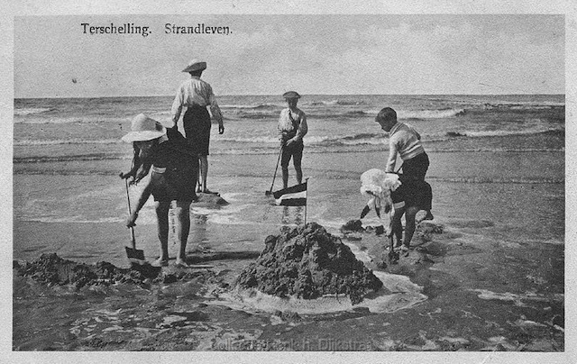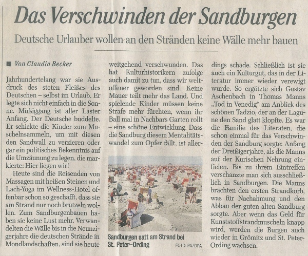 Kortom: tijd voor een goede cultuurhistorische studie naar de strandburcht. Daarvoor trof ik al deze aardige aanzet in de Berliner Morgenpost, waarvan de auteur opmerkt dat de typisch Duitse zandkuil in onbruik raakt, verwaait en verdwijnt nu het land steeds opener en internationaler wordt. Intussen graaft bang Nederland zich steeds dieper in achter de dijken. Ik bedoel maar, het kan verkeren.